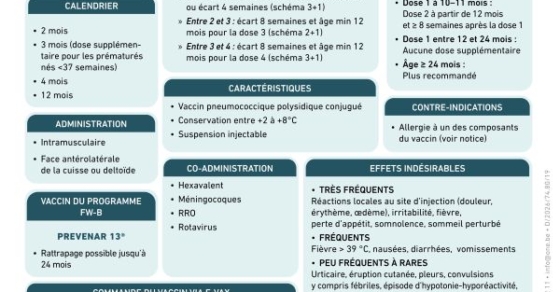 Dans ces fiches, vous trouvez les informations concernant, entre autres, le moment de vaccination, les caractéristiques du vaccin, les contre-indications, les co-administrations possibles, le vaccin disponible dans le cadre du Programme de vaccination. C’est un mémo que vous pouvez utiliser dans votre pratique de tous les jours.