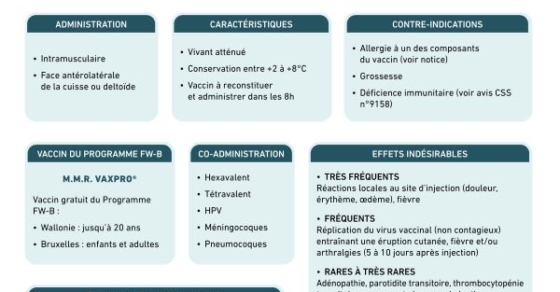 Dans ces fiches, vous trouvez les informations concernant, entre autres, le moment de vaccination, les caractéristiques du vaccin, les contre-indications, les co-administrations possibles, le vaccin disponible dans le cadre du Programme de vaccination. C’est un mémo que vous pouvez utiliser dans votre pratique de tous les jours.